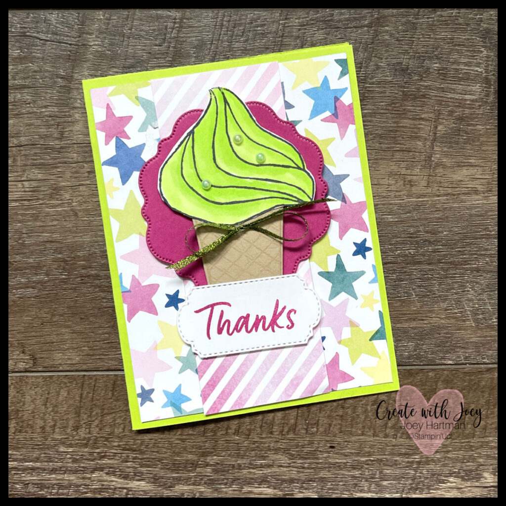 The star of the Ice Cream Swirl bundle from Stampin’ Up! is the adorable ice cream cone and dies!Today I’m sharing a fun thank you card I made with this charming set.